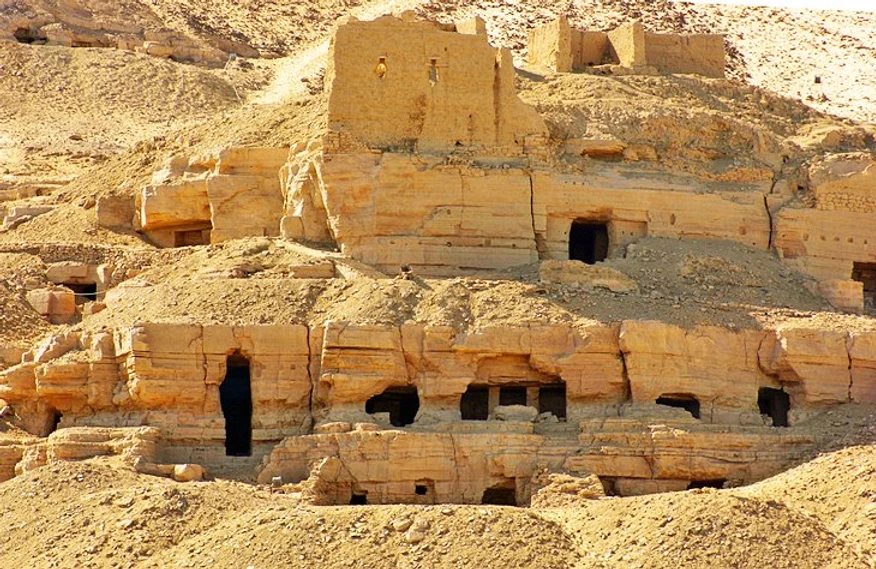 A necropolis of tombs spanning the Old, Middle and New Kingdoms, belonging to Ancient Egyptian officials and nobles. The tombs are on varying levels of a hilltop, with a domed tomb of an Islamic sheikh on the very top.